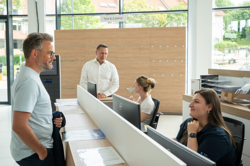 „Wir möchten Emotionen wecken, nicht nur Autos verkaufen“, erklärt Roberto Gomez, Serviceleiter Pforzheim. Das zeigt sich im offen gehaltenen Verkaufsraum, wo rund 20 Neuwagen der beiden Marken präsentiert werden. Verkäufer*innen treten proaktiv an die Kunden heran – statt festem Schreibtisch gibt es freie Beweglichkeit im Raum. Rückzugsorte für individuelle Beratung und Vertragsabschluss befinden sich diskret im Backoffice.