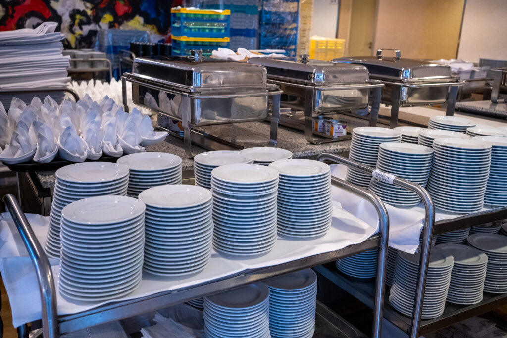 Rund 300 Gäste werden am Abend erwartet – mit drei Menüvarianten: Fleisch, Fisch oder vegetarisch. Schweinefleisch steht aus Rücksicht auf alle Gäste nie auf der Karte. „Wir wissen genau, was funktioniert – man muss das Rad nicht jedes Mal neu erfinden“, sagt Kubina. In der Produktionsküche wird alles sorgfältig vorbereitet: gegart, abgeschmeckt, haltbar gemacht. Die Speisen gehen dann über den sogenannten „Pass“ in den angrenzenden Raum im CCP, wo sie in Chafing Dishes warmgehalten und an zwei Fließbändern angerichtet werden.