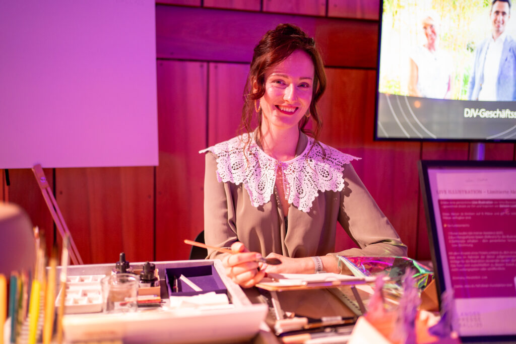 Auch im Silcher-Saal begleitete die Stuttgarter Modeillustratorin Inha Barsukova den Abend mit ihren eleganten Fashion-Illustrationen, zu denen sich die Gäste anmelden konnten. Neben einem großen Motiv, das den gesamten Abend prägte, verwandelte sie Fotos der Anwesenden und besondere Momente in filigrane Aquarelle. Die individuellen Zeichnungen boten den Gästen ein stilvolles Andenken an die glanzvolle Veranstaltung.