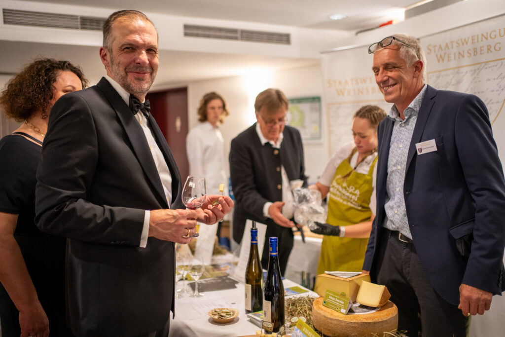 Kulinarisch bot der Landespresseball ebenso viel zu entdecken. In mehreren Foyers verwandelten sich die Räume in Genussinseln: Im Beethoven-Foyer präsentierten LEICA, Elia Homes Immobilien und St. Kilian Distillers ihre Angebote, während im Silcher-Foyer unter anderem die Baden-Württemberg Stiftung, The Feed, LfK, der SWR und das Staatsweingut Weinsberg vertreten waren. Ergänzt wurde das Programm durch die Dorfkäserei Geifertshofen, die Bio-Käse aus Heumilch zum Probieren anbot. Das Maritim Hotel Stuttgart sorgte an verschiedenen Ständen für Live-Cooking, Snacks und Drinks, darunter die Rothaus-Bar sowie die Champagner-Bar der Equipe Bar, und rundete so das kulinarische Angebot des Abends ab.
