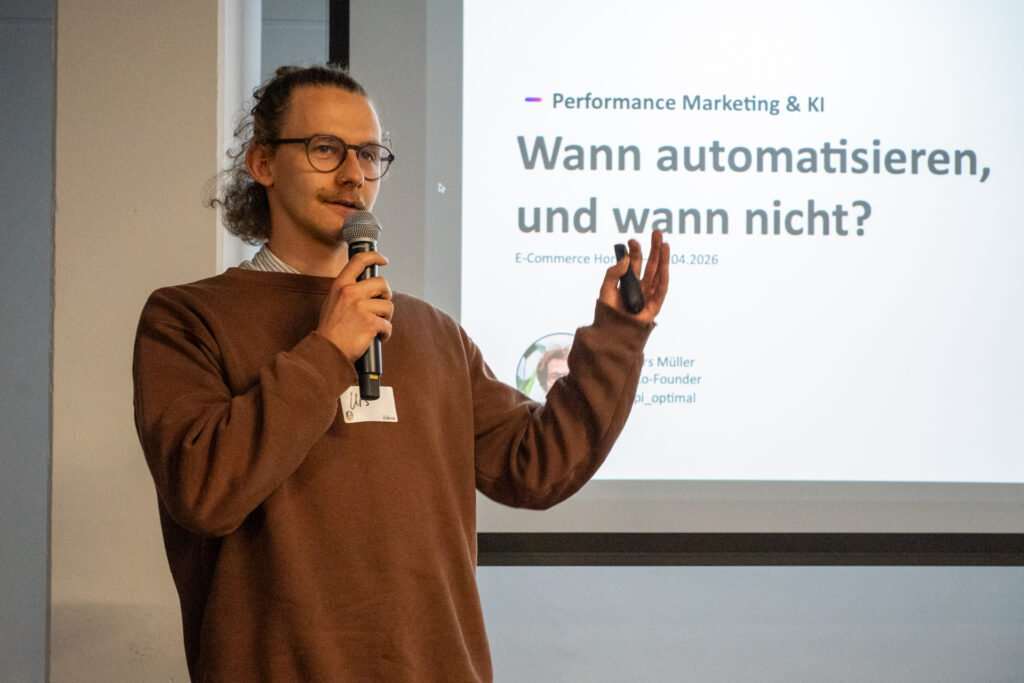 Urs Müller, Co-Founder des Start-ups pi-optimal, knüpfte thematisch an und beleuchtete den Einsatz von KI im Performance-Marketing. Seine zentrale These: Vollautomatisierung ist selten die beste Lösung.