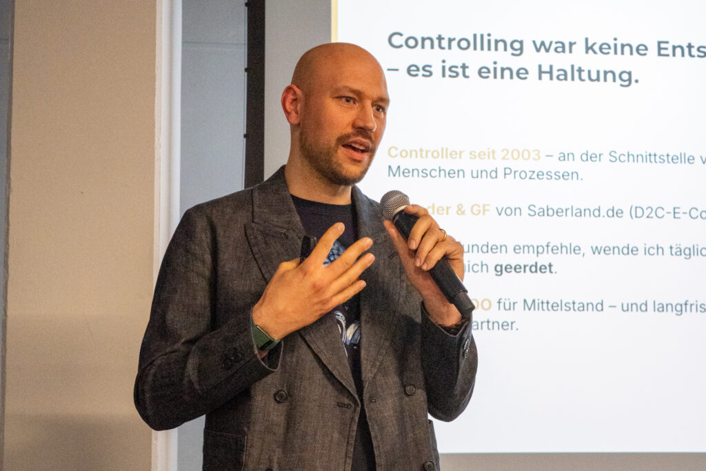 Den Abschluss bildete Kai Schemenauer, Founder von Saberland und Interim-CFOO. Mit einem Lichtschwert am Gürtel – augenzwinkerndes Markenzeichen – machte er deutlich, dass es in seinem Vortrag um Klarheit und Durchblick geht.