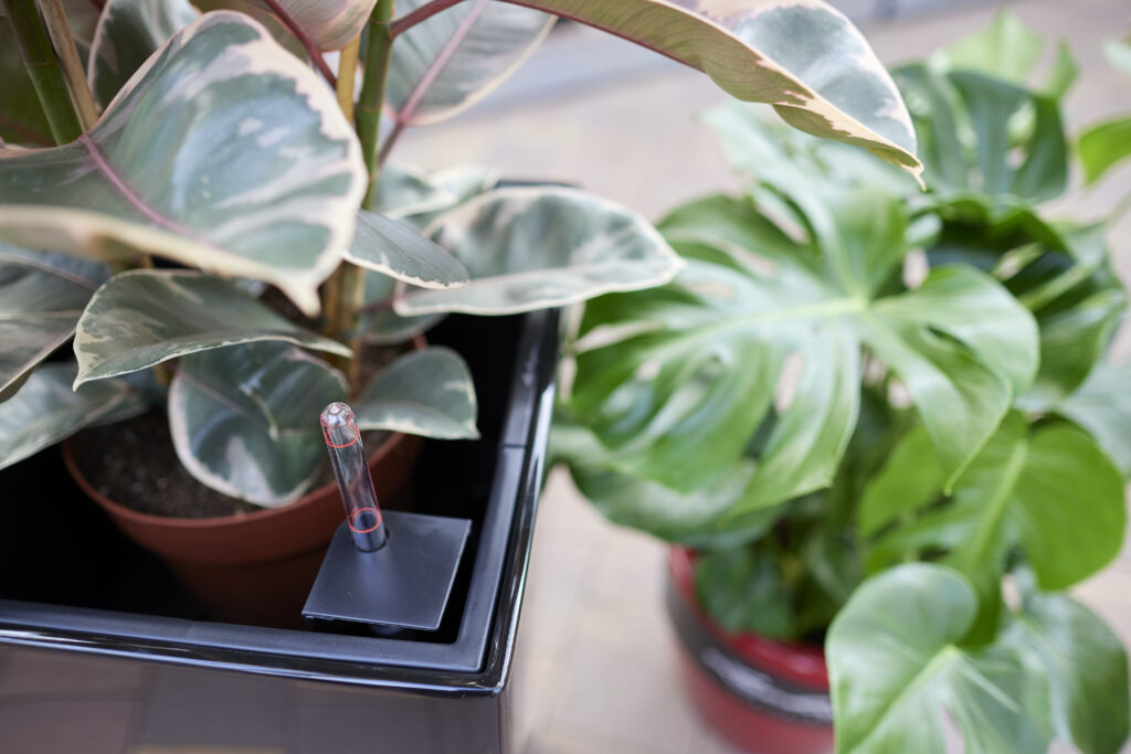 Eine Hilfe bei der Pflanzenpflege kann ein Feuchtigkeitsmessgerät sein. „Das nehme ich auch für meine eigenen Pflanzen“, sagt Regina Radau. „Und das funktioniert auch für Pflanzen im Außenbereich.“ In einem Topf trocknet die obere Schicht der Erde relativ schnell ab, was nicht bedeuten muss, dass weiter unten kein Wasser mehr vorhanden ist. Sie macht darauf aufmerksam, dass man das Gerät nach der Messung nicht in der Erde stecken lassen sollte, da sonst der Messfühler korrodiert und die Werte nicht mehr korrekt anzeigt. Töpfe mit Wasserstandsanzeige bieten ebenfalls eine gute Orientierung und sind damit ein guter Schutz vor dem Übergießen. Entsprechende hochwertige Pflanzgefäße in vielen Farben und mit verschiedenen Oberflächen, wie Korbstruktur, Steinoptik oder in Hochglanz, stehen beispielsweise von Lechuza zur Auswahl parat. Nicht selten wünschen die Kunden Gefäße passend zu den Firmenfarben. Damit es die Reinigungskräfte leichter haben, können größere Töpfe auch mit versteckten Rädchen ausgestattet werden, so dass auch schwere Pflanzen einfach verschoben werden können. Selbstverständlich werden im Gartencenter Streb auch vorhandene Gefäße bepflanzt. Besonders beliebt in den Büros sind beispielsweise der buschige Kolbenfaden, Bogenhanf in kleiner oder großer Variante oder der genügsame Philodendron. Da sie so pflegeleicht sind, verschönern sie auch oft private Wohnungen. „Viele junge Leute beschäftigen sich heute wieder intensiv mit Pflanzen“, freut sich die Gärtnerin über den aktuellen Trend.