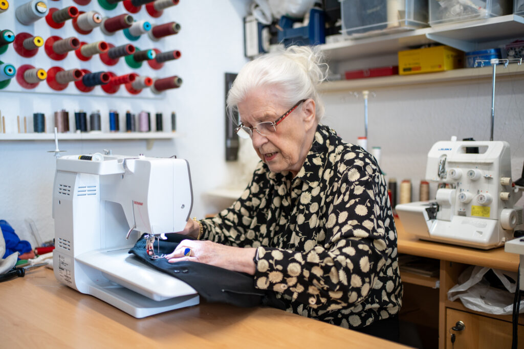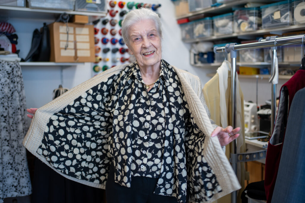 Die quirlige, fröhliche Dame trägt eine schwarz-weiß gemusterte, perfekt sitzende Seidenbluse und eine elegante schwarze Hose, und blickt aus ihrer Wohnung im 17. Stock über die Schwäbische Alb bis zum Hohenasperg. Hier lebt sie seit 33 Jahren mit ihrem zweiten Mann – und hier befindet sich auch ihr kleines Atelier, in einem Zimmer der 130 qm großen Wohnung. Zwischen Garnrollen, Nähmaschinen und maßgeschneiderten Stücken empfängt die 84-jährige Damenschneidermeisterin nach wie vor ihre Kundinnen, viele von ihnen sind ihr seit Jahrzehnten treu geblieben.
