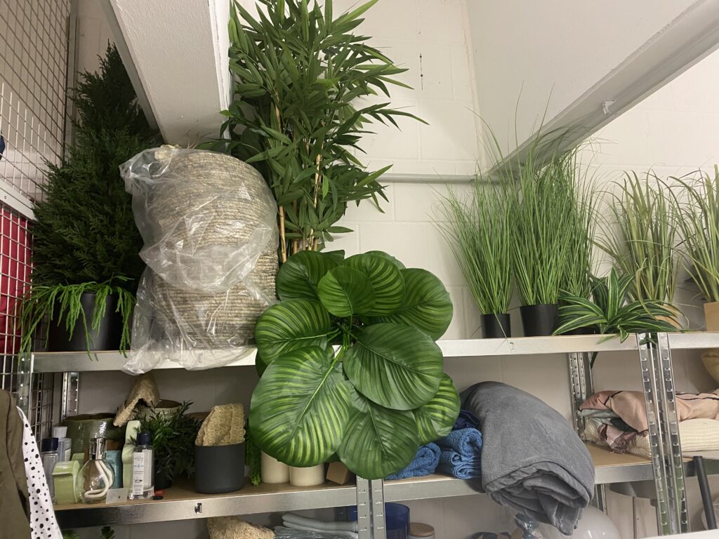 Auf der Wilferdinger Höhe nahe Denns Biomarkt gibt es eine graue fast unscheinbare Tür, den Schlüssel dafür hat Nadja Liebe. Hier befindet sich ihr gut gefülltes Lager und wenn man hier durchstreift, fühlt man sich ein bisschen wie am Filmset: Pappküchen, täuschend echte Tortenstücke aus Schaumstoff, Designkleiderständer und Kunstpflanzen, die fast besser aussehen als ihre echten Vorbilder. „Die kommen ständig zum Einsatz“, lacht sie. „Selbst Küchen aus Pappe können eine Immobilie warm wirken lassen. Viele denken bei Homestaging, dass wir nur Kissen aufschütteln“, sagt sie und lacht. „Aber es ist viel mehr als das.“ Vieles in ihrem Lager stammt aus Holland.