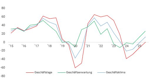 Der Wert zur Geschäftslage im Gesamtjahr 2025 liegt bei 0 Punkten und ist damit deutlich besser als vor einem Jahr (minus 29 Punkte). Der Wert der Geschäftserwartung ist mit 26 Punkten ebenfalls deutlich besser als vor einem Jahr (minus 5 Punkte) und erreicht den höchsten Wert seit Ende 2022.