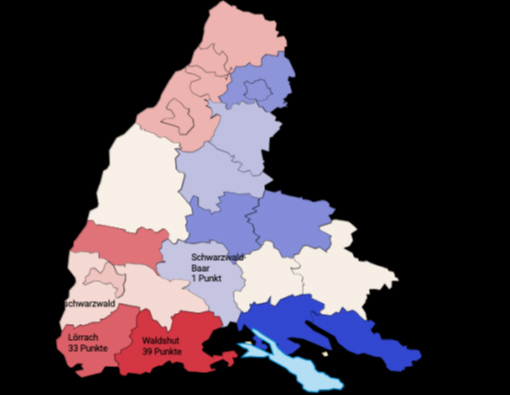 Im negativen Bereich liegt das Klima in Pforzheim und dem Enzkreis (minus 11 Punkte), Rottweil und dem Zollernalbkreis (minus 13 Punkte) sowie in Konstanz und dem Bodenseekreis (minus 30 Punkte).