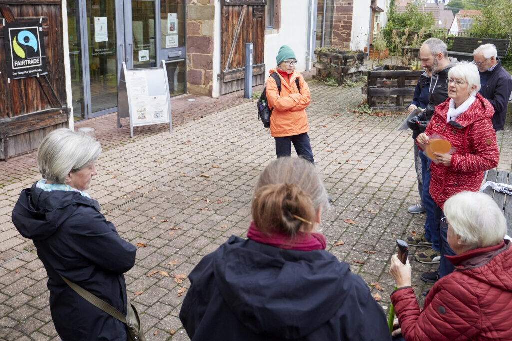 Bereits seit elf Jahren gibt es in Heimsheim eine Fairtrade Gruppe. „Fairtrade ist die weltweit größte Organisation, die sich dem Thema Nachhaltigkeit anschließt“, so Cornelia Packmor, die mit ihren Mitstreitern Therese Joachim und Christian Ulrich die Teilnehmer des Rundgangs begrüßte. Die beiden Damen gehören zu den Gründungsmitgliedern der Heimsheimer Fairtrade-Gruppe, Ulrich ist erst kürzlich dazu gestoßen. Packmor berichtete, dass Fairtrade den Blick vor allem auf Kleinproduzenten im sogenannten globalen Süden richtet. „Insgesamt gibt es 1.600 Organisationen, die wir unterstützen“, erklärte sie. Die Betriebe wirtschaften unter ökologischen, ökonomischen und sozialen Aspekten und verzichten beispielsweise auf Kinderarbeit. „Alle Produzenten werden regelmäßig von einer unabhängigen Organisation kontrolliert und müssen die strengen Regeln, die Fairtrade aufstellt, immer wieder beweisen“, führte sie weiter aus. Die Gruppierung ist regelmäßig auf dem örtlichen Krämermarkt und am Weihnachtsmarkt vertreten und verkauft Produkte aus dem Eine-Welt-Laden Weil der Stadt. Zudem werden Vorträge und ein Fairtrade Frühstück organisiert sowie die siebten Klassen im Unterricht besucht.