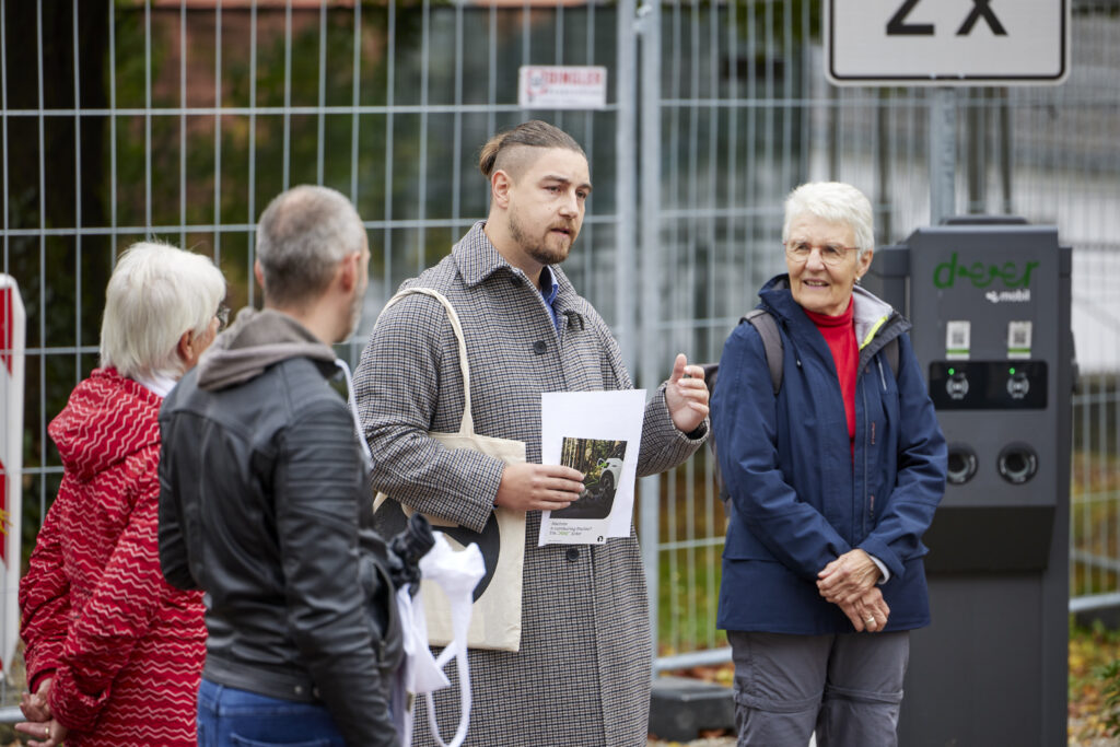 Ein weiterer Aspekt von Nachhaltigkeit wurde an der letzten Station des Rundgangs betrachtet. Auf dem Parkplatz vor dem Heimsheimer Schloss wartete Abdulah Suljic von der Firma deer auf die Gruppe. „Carsharing ist für Menschen, die nur gelegentlich Auto fahren oder auf ein Zweitauto verzichten wollen“, erklärte er zum klimafreundlichen E-Carsharing. Suljic betonte, dass sich das Unternehmen mit seinem Mobilitätsnetz speziell auf den ländlichen Raum konzentriere und ein stationsflexibles System anbietet. Dadurch können die Fahrzeuge auch an anderen deer-Stationen wieder abgegeben werden. „Sie können stolz sein, dass es in Heimsheim e-Carsharing gibt“, sagte er. „So treiben sie nachhaltige Mobilität selber vorwärts.“