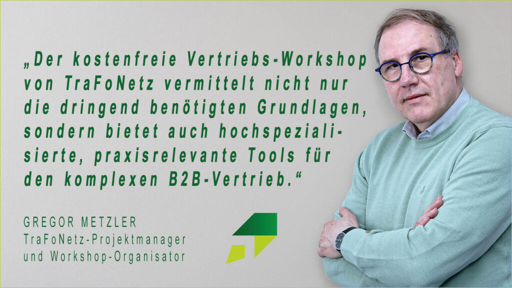 „Der TraFoNetz-Workshop wurde konzipiert, um genau diese Lücken zu schließen“, so der TraFoNetz-Projektmanager. Vermittelt würden nicht nur die dringend benötigten Grundlagen, wie beispielsweise der Sales Funnel, also die einzelnen Stufen des Verkaufsprozesses. Der Workshop biete auch hochspezialisierte, praxisrelevante Tools für den komplexen B2B-Vertrieb.