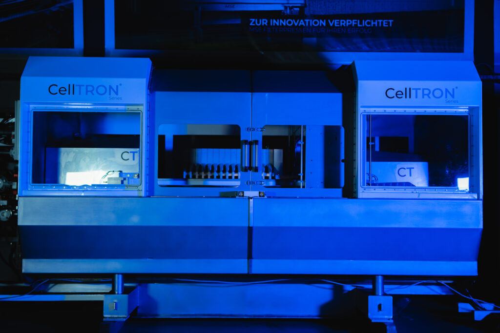 Gemeinsam mit dem Kunden entwickelte MSE über zwei Jahre hinweg eine völlig neue Filterpresse. Viel Hirnschmalz, zahlreiche Schleifen, immer neue Anpassungen. Am Ende stand eine Neuentwicklung: die CellTRON – eine vollständig gekapselte Membranfilterpresse mit integriertem Reinigungssystem.
